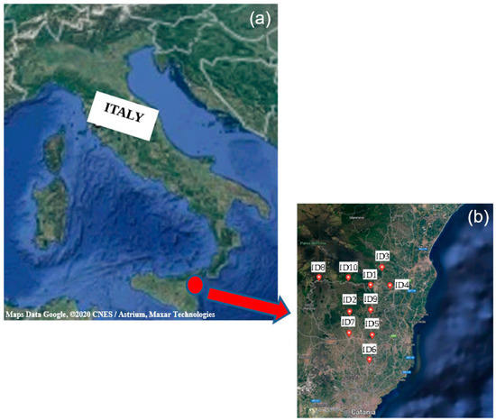 Pyroclastic products were collected according to [22]. In particular, in the ID 1, 4, 5, 7 and 9 sites, freshly erupted air-fall pyroclastic products were sampled, while in the remaining ID 2, 3, 6, 8 and 10 sites, samples from heaps of pyroclastic wastes from previous volcanic activities were collected [22]. The samples were stored into labeled plastic vials, with adequate caution taken in order to prevent their contamination.