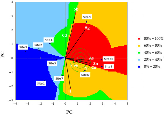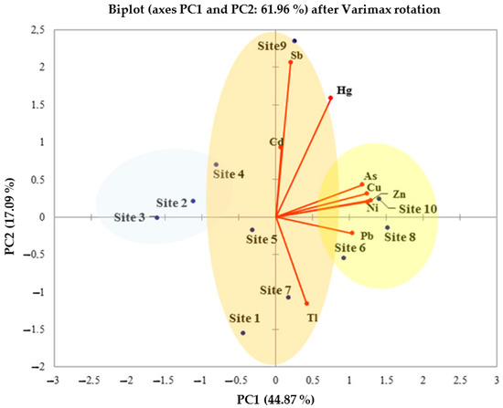 As far as the PCA algorithm is concerned, ten variables (Site IDs, CAs, Ccd, CCu, CHg, CNi, CPb, CSb, CTl and CZn) were processed, also performing the Varimax rotation [46]. The obtained results are reported in Figure 2.