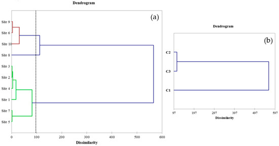 Figure 3 shows the outcome dendrogram of the HCA. The dotted line represents the cut automatically made by the calculation algorithm, which allows us to identify the formation of three clusters (C1, C2 and C3).