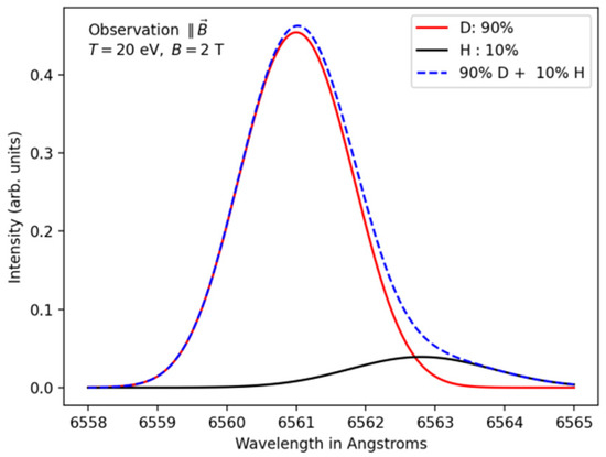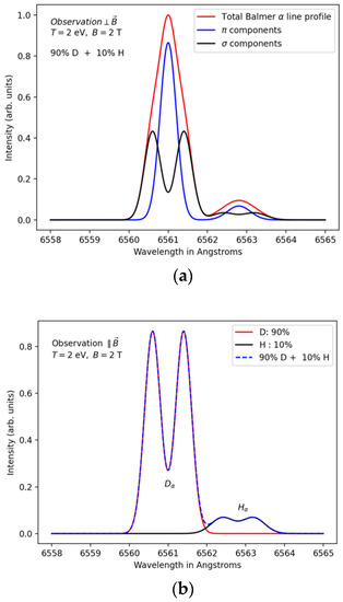 Zeeman–Doppler profiles of the Balmer-α lines (Hα/Dα) computed for a gas mixture composed of 10% of hydrogen and 90% of deuterium with a temperature of 2 eV in the presence of a magnetic field of 2 T. (a) Perpendicular observation (): for each hydrogen isotope, the total line profile (red solid line) is a sum of a central component (blue solid line) located respectively at Å for Dα and for Hα lines and two lateral and components (black solid line). (b) Parallel observation: the spectrum was calculated for a parallel observation with respect to the magnetic field direction, i.e., for an angle or .