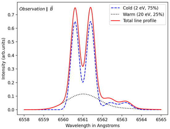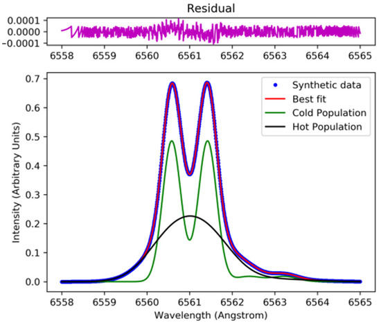 An example of the fitting of a synthetic Dα/Hα line profile calculated for a parallel observation with respect to the magnetic field direction. A least-square minimization Python algorithm was used to infer various parameters. The known and deduced parameters are summarized in Table 1.