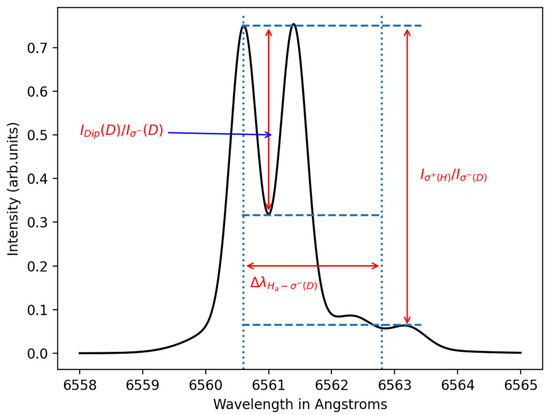 A scheme of a two-temperature Zeeman–Doppler Hα/Dα line profile indicating the spectroscopic characteristics which are part of the features data for the regression algorithm: the wavelength separation between the non-perturbed Hα wavelength and the blue-shifted (left component) component of the Dα line, the ratio of the intensity of the Dα dip to the intensity of its component, i.e., , and the ratio of the intensity of the component of the Hα line to of the component of the Dα line.
