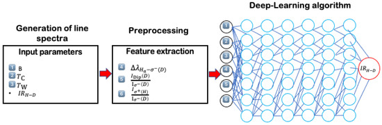 Machine learning algorithms require features and target data. For our application, we have used six input features. These are the strength of the magnetic field , the temperatures and of the cold and warm neutral populations, the difference between the non-perturbed wavelength of the Hα line and the blue-shifted component of the Dα line, the ratio of the intensity of the Dα dip (or unshifted Dα wavelength ) to that of its component, i.e., and the ratio, of the intensity of the component of the Hα line to of the component of the Dα line. The last three features are illustrated in Figure 5. The target data is the fraction of hydrogen neutrals or the isotopic ratio H/H+D. More precisely, we used a preprocessing program which computes many synthetic profiles by varying the magnetic field strength and the temperatures and relative fractions of both cold and warm H and D neutrals for a mixture of H and D with up to 25% of hydrogen. For the results presented here, we have used the typical following parameters: B in the range 1–5 T, cold and warm temperatures with the following respective values eV and eV, cold neutral fraction in the range 20–80% and a hydrogen concentration (isotopic ratio) in the range 1–25%. After calculating the line profiles, the preprocessing program extracts for each calculated profile the features described previously and transmits them to the regression algorithm. The whole process is illustrated in Figure 6.