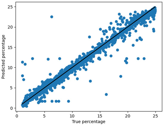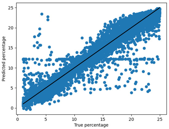 Now, concerning the validation of the method, we have generated a total of 20,000 other theoretical spectra in a similar mater as for the generation of the training set. The results of the DL algorithm are shown on Figure 9, as the predicted values of the hydrogen isotopic ratio are plotted as a function of the true values. For the test phase, the mean square error was estimated to be 7.9% while the median error value is 2.6%. One can see from the figure some outlier points for which the predicted values are far from the known values, but for the majority of the data, the predicted values match well the known values.