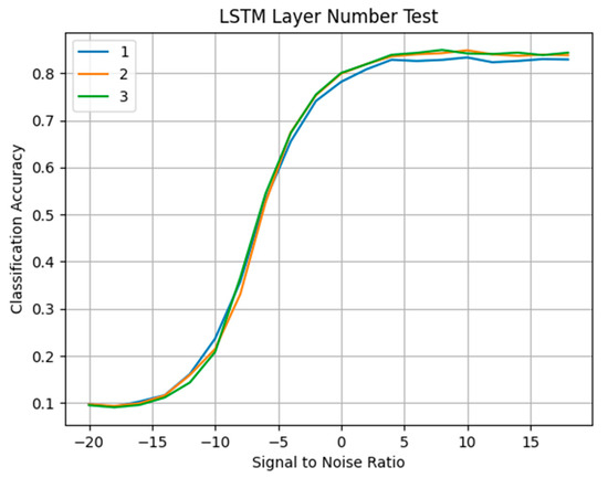 The accuracy will improve by adding LSTM layers. In Figure 6, it can be seen that the two-tier LSTM network has about a 3% accuracy improvement, compared to the one-layer network. After continuing to increase the number of LSTM layers, the results do not change a great deal, so the two-layer LSTM is set.