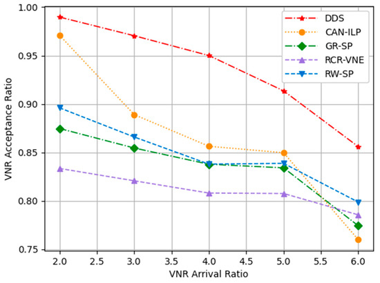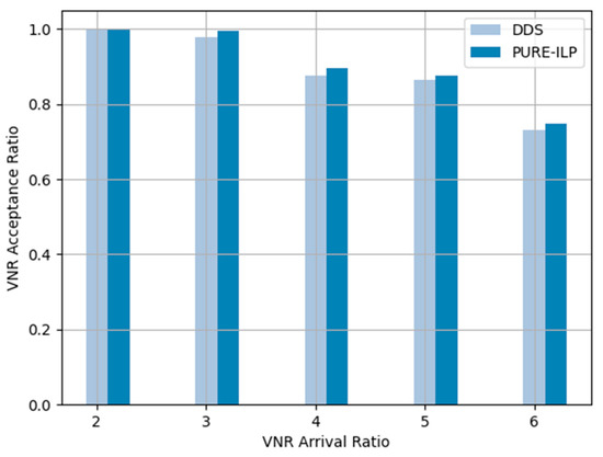 Comparison of DDS with PURE-ILP under various VNR arrival ratios.
