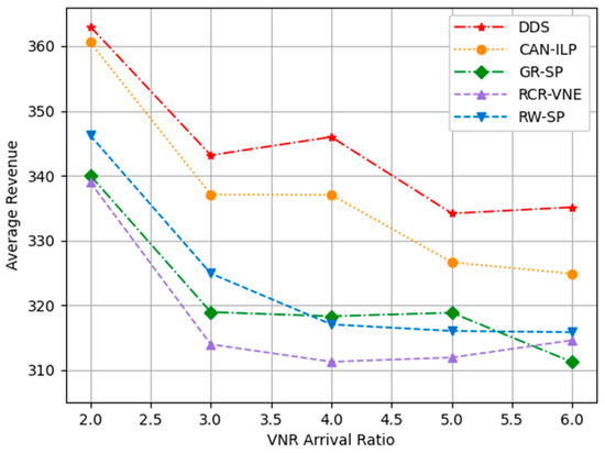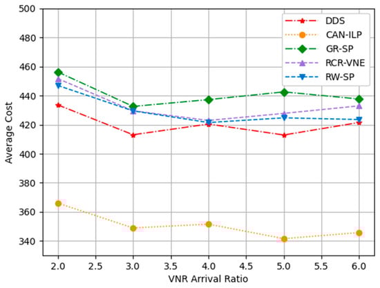 Figure 4, Figure 5 and Figure 6 describe the average revenue, average cost, and revenue–cost ratio under different virtual network request arrival ratios. It can be seen that the algorithm of [14] has the minimum average cost and the maximum revenue–cost ratio, the revenue–cost ratio is 93.998% to 98.516%. This is because it adopts integer linear programming to solve based on minimizing cost, so it performs well in the average cost. Compared with other algorithms, our algorithm has the lowest average cost and the maximum revenue–cost ratio. The revenue–cost ratio is 79.515% to 83.781%, which is about 5% to 10% higher than other algorithms. Our algorithm has the largest average revenue among all algorithms. The above indicates that our algorithm effectively utilizes the substrate network resources and saves the available resource space for subsequent virtual network requests.