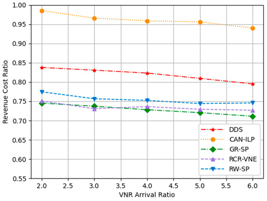 The revenue–cost ratio provides a metric of revenue and cost which is used to evaluate the utilization efficiency of the substrate network resources, and its value is less than or equal to 1. If each virtual network embedding algorithm can successfully map a virtual network to the substrate network, then the revenue of the virtual network is the same, and the algorithm with a larger revenue–cost ratio indicates that the substrate network resources are consumed less. Equation (9) gives the definition of revenue–cost ratio.
