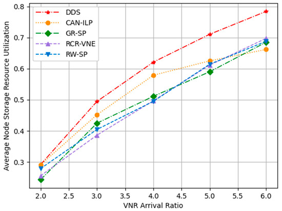 Figure 7 and Figure 8 describe the node computing resource utilization and storage resource utilization, while Figure 9 describes the link bandwidth resource utilization. With the increase of the virtual network request arrival ratio, the node resource utilization and link resource utilization of all algorithms increase accordingly. Compared with other algorithms, our algorithm has the highest resource utilization. Our node resource utilization is approximately 80%, while other algorithms are less than 70%, indicating an optimization of 10%. The link resource utilization is approximately 30%. The reason for the low link resource utilization in all algorithms is that the existence of the link propagation delay constraint and path splitting is not supported. The high resource utilization is because our algorithm can receive more virtual network requests than other algorithms and can use the substrate network resources for mapping more efficiently.