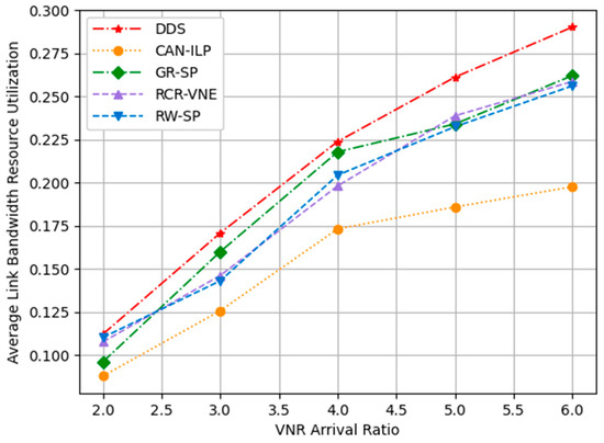 Average link bandwidth resource utilization under various VNR arrival ratios.