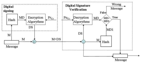 Digital signing is a procedure for assigning a digital signature to a message (Figure 1). By using a one-way function, the message is transformed into a hash value, MD. Then, the hash value is encrypted by an asymmetric cryptographic algorithm (e.g., RSA) and the private key of the signer, PrKs. The value obtained is the digital signature of the message (MD) appended to the message, M.