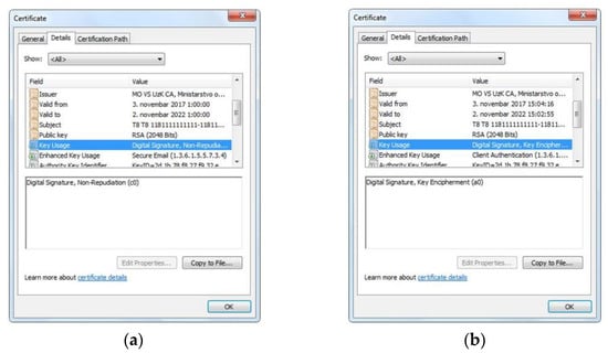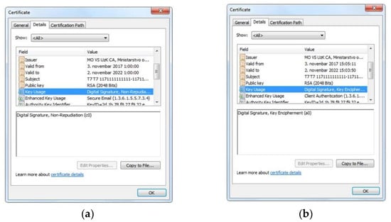 Figure 5. Digital certificates for end user. (a) Digital certificate for electronic signature; (b) Digital certificate for encryption. - Installing the trust path. The root certification authority such as trust point (MOVSRootCA) is installed, followed by the certificate of the subordinate certification authority (MOVSUzKCA). The point of trust is the point, i.e., the certification authority, from which the entity’s certificate starts the validation of the certification path. A certificate path is a chain of trust between certification authorities that verifies that a certificate comes from the right issuer.