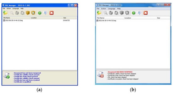 The verification of the electronic signature was performed successfully, which means that there were no changes in the content of the original file generated by the LiDAR radar. In this way, the integrity of the data is preserved. Figure 7a shows the content of the original file. The public key contained in the signer’s certificate is used in the verification process. Based on the messages received during verification, we see that the signer’s certificate (LiDAR radar) is valid and that the chain of trust trusted by the signer is valid. Since both parties trust the Certification Authority of the MoD and SAF, which issued the certificate, the end user can be sure that the received file is generated on the side of the real LiDAR radar. In this way, the authenticity of the sender or the creator of the LiDAR file received by the recipient was demonstrated.