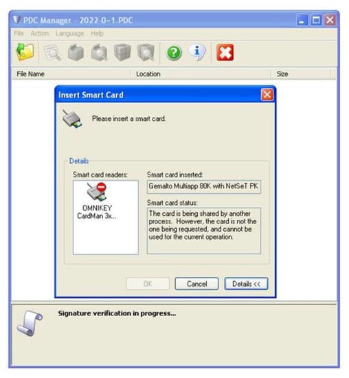 Using the e-Doc Encryptor application we simulated electronic signing on the LiDAR side of the associated certificate for electronic signing and the means for creating a qualified electronic signature (smart card). The resulting digitally signed file was sent to the end user who verified the electronic signature, Figure 6.