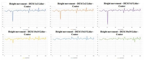 Since the unified graph of the movement of height values does not show certain anomalies, it is necessary to divide the graphics (Figure 10). By dividing graphs, it can be noticed that the impact of this type of error is present most in digital models of higher spatial resolutions, such as 1, 2, and 5 m. While in digital models of lower spatial resolutions, such as 10, 20, and 30 m, the impact of this error is eliminated.