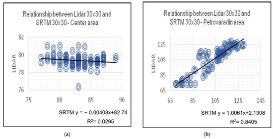 Figure 13a shows the linear regression for LiDAR and SRTM digital elevation models based on the sample value of hundred points. The equation that is derived is the relationship between the LiDAR and radar digital models, and for the Center area reads y = −0.0408x + 82.74, where the value of x represents the radar DEM, and y represents the LiDAR DEM. The percentage value determination is also calculated, which in statistics represents the percentage of variation of the dependent variable that is predictable from the other independent variable.