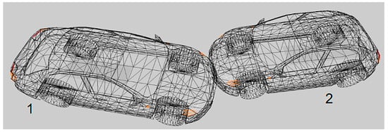 The simulation of a collision of two passenger vehicles (no. 1 and 2 in Figure 1) has been prepared for the locked front wheels during the simulation.