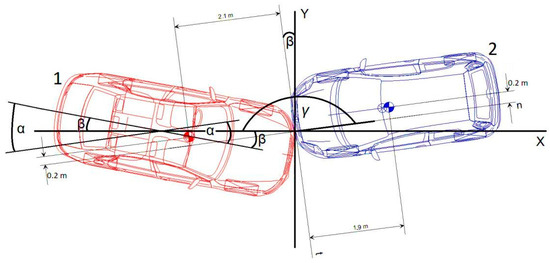 It seems convenient to present the adopted method graphically so that all the necessary trigonometric transformations can be easily applied. Therefore, in Figure 4, the mutual location of both vehicles is presented at the moment of initial contact, along with the necessary dimensions and the adopted Ont coordinate frame. At first, only the planar view is necessary, as the planar motion will be considered.