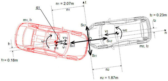 - Sn1, St1, Sn2, and St2—components of the force impulses of vehicles no. 1 and 2, respectively.