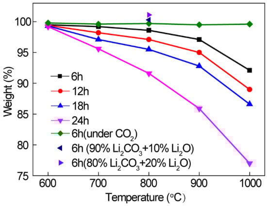 The electrochemical reduction reaction of carbonate and hydroxide will occur at high temperature, and the thermal decomposition reaction will inevitably occur at the same time. As a competitive electrolytic reaction, the occurrence of thermal decomposition reactions will reduce the conversion of the target product and lead to energy independent loss. There has been some research reporting that the thermal stability of carbonates decreased with increasing temperature as Equation (1) describes [23,24]. As is shown in the picture, the weight of Li2CO3 is almost constant under an open atmosphere (~0.03% CO2), but dropped significantly over 800 °C. Thus, it indicates that the thermal decomposition reaction of Li2CO3 will not occur below 800 °C. Another obvious pattern is that prolonged reaction time leads to a more severe decrease in the weight of Li2CO3. It is evident that the weight decreases from 97.1% at the 6 h point to 85.9% at the 24 h point under 900 °C. According to the principle of chemical equilibrium, the reaction can be prevented from proceeding in the positive direction by increasing the concentration of the products in the system. It is indicated by the green line that the weight of Li2CO3 shows hardly any change, only 0.2% at 1000 °C after 6 h. Therefore, it is suggested that excess CO2 rapidly combines with newly generated Li2O in molten salts and produces Li2CO3 again from the decreased weight loss. Similarly, we tried to increase the concentration of another product, Li2O to further slow the thermal decomposition of Li2CO3. Proof by the navy blue and the purple point in Figure 1, that Li2O can not only slow down the mass loss of Li2CO3 at high temperature, but also capture more CO2 into the molten salt system (Equation (2)).