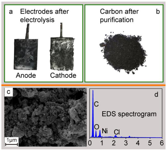As shown in Figure 2, a layer of solid carbon and melts is observed, following the chemical reaction, Equation (3), occurring on the surface of the galvanized iron cathode. There are some carbonates remaining on the surface of carbon products. It also explains why the acid pickling operation is essential for purification of carbon materials. Figure 2b shows that the purified carbon material after pickling—ultrasonic water cleaning—drying post-treatments. An EDS spectrogram is used to analyze the elemental composition and SEM is used to detect the microstructure of the obtained solid products. As displayed in Figure 2d, the molar ratio of the C element accounts for an overwhelming 90%, while only 10% of other elements remain. The obtained solid black powders are indeed carbon-based materials. The Ni element is derived from anodic corrosion during electrochemical reaction. The Cl element is derived from the hydrochloric acid pickling process, and the Au element comes from the gold spraying operation for EDS-SEM analysis. According to the previous reports, O is believed to originate from oxygen functional groups in carbon products [25,26].