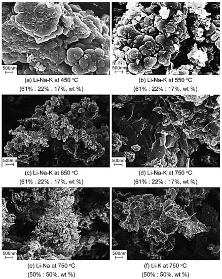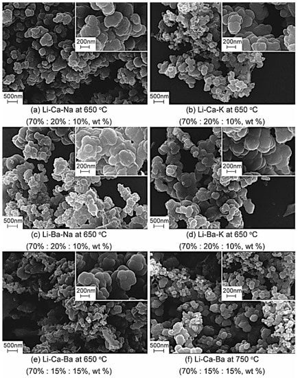 Using the same electrode system as before, nickel wire (effective area 10 cm2) and galvanized iron (effective area 5 cm2) are employed as anode and cathode. The carbon products display a spherical structure generated in the molten salt containing calcium or barium carbonate via electrolysis at relatively high temperatures (650 °C or 750 °C). The microstructure of cathode carbon products, separated from the cathode surface in the electrolyte of Li2CO3 + CaCO3 + Na2CO3, Li2CO3 + CaCO3 + K2CO3, Li2CO3 + BaCO3 + Na2CO3, Li2CO3 + BaCO3 + K2CO3 and Li2CO3 + CaCO3 + BaCO3, is shown in Figure 4 in detail. Different from the amorphous carbon products synthesized in Li2CO3 + Na2CO3 + K2CO3 molten salt system, the morphology of carbon products of Li2CO3 + CaCO3 + Na2CO3 and Li2CO3 + CaCO3 + K2CO3 electrolytic systems at 750 °C shows a tufted sphere structure. The sphere diameter ranges from 300 to 500 nm, and the carbon spheres are superimposed.