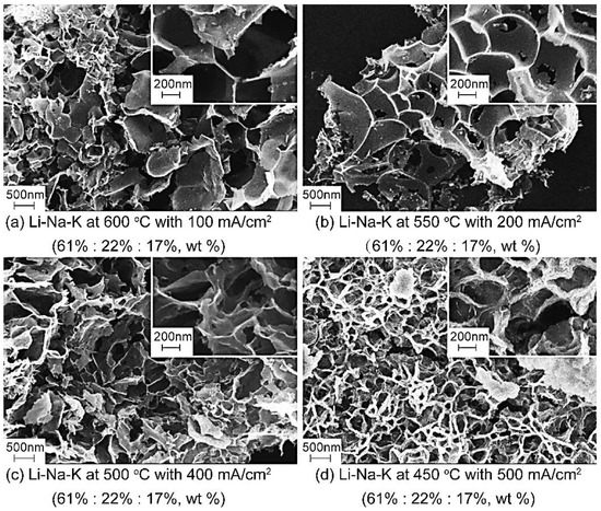 In Li2CO3 + Na2CO3 + K2CO3 system (mass fraction 61%:22%:17%), nickel-chromium alloy is used to replace nickel as the anode material and galvanized iron as the cathode. The effective area of the cathode and anode are both 5 cm2. And the current density of 100, 200, 400 or 500 mA/cm2 is applied for constant current electrolysis at different temperatures. Unlike the previously reported butterfly wing carbon sheet, the honeycomb structure shows a high degree of regularity, and its content is more than 80%, as displayed in Figure 5a–d. The aperture distribution of the honeycomb structure is broad, ranging from the nanometer to micron level. Honeycomb carbon, formed by stacking sheets of carbon together, has a compact structure and high specific surface area. According to BET, the specific surface area of cellular porous carbon, separated from the electrolysis product at 450 °C with 500 mA/cm2 in Li2CO3 + Na2CO3 + K2CO3 electrolyte, is up to 198 m2/g. The surface area of carbon material with honeycomb structure can be further improved by decreasing the electrolysis temperature or applying higher current density. In addition, honeycomb-like carbon materials with high specific surface area have essential applications in gas adsorption and material transportation. Under this electrolytic condition, the cell voltage is about 3.2 V, considerably higher than the theoretical deposition potential of Li+, Na+ and K+. Consequently, at such high cell voltages, the carbon products deposition process is accompanied by an alkali metal deposition reaction. It is inferred that the co-deposition of alkali metals is a crucial factor in forming the honeycomb-like structure of carbon.