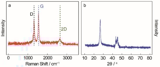 (a) Raman spectrum of cellular porous carbon. (b) XRD of cellular porous carbon.