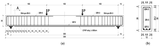 Construction drawing of tested beams: (a) side view and (b) cross-section [2,3].