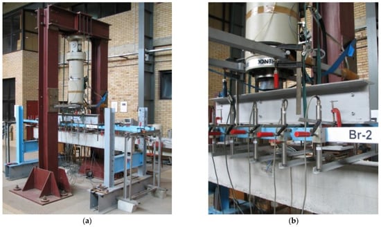 Research stand with beam during the tests: (a) view on the whole beam and actuator; and (b) view of load bearing traverse and on the deflection measurement points.