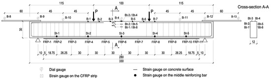 During the experiments, deflections of beams, strains of concrete in the midspan of beams, strains along the middle reinforcing bar, as well as the longitudinal strains along the composite strip were recorded. The force applied to the beam was also controlled and recorded. Furthermore, constant monitoring of crack arrangement on the side and bottom surfaces of all beams at each level of loading was performed. The arrangement of measurement points on all beams is shown in Figure 3.