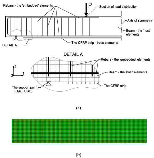 Figure 4a shows the overall layout of the 2D model of a half of the beam with an indication of the method of supporting and applying the load as well as the method of connection between the nodes of the beam and nodes of the strip. The finite-element model of RC beams used in computations is shown in Figure 5b. In the model, the symmetry of the beams was taken into account. Hence, the model of a half beam was made with the appropriate displacement constraints imposed on the appropriate axis of symmetry.
