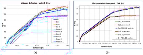 (a) Deflections of the point in the middle of beam span (point B-4 according to Figure 3) obtained in experiments. (b) Comparison of experiment and FEA results—point B-4 deflection for RC beam (Br) and beam with CFRP strip (Bz).
