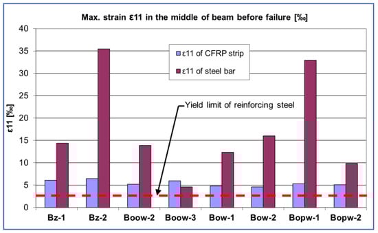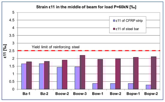 The values of strains of composite strips and reinforcing bars in the middle of the beam span for different load levels are presented in Table 4. Table 4 is illustrated in Figure 6 and Figure 7, which show the quantitative relationship between the strip and reinforcing steel strains for individual beams for the load P = 60 kN and for the beam failure moment. Table 4 shows that the initiation of the destruction of all beams took place in the reinforcing bars in the central zone of beams due to the steel yielding (εpl = 2.5‰). The rapid increase in the deformation of reinforcing bars on the central sections of the beams resulted in an immediate increase in the deformation of composite strips on these sections. The maximum strains of the composite strip with the failure of the beams ranged from 4.58‰ for the beam loaded before the strengthening with the strip (Bow type) to 6.45‰ for the beam strengthened with the strip from the beginning of loading (Bz type).
