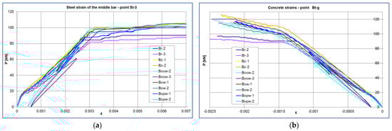 (a) Strains of middle reinforcing bar measured in the cross-section at the center of beam span (point St-3 according to Figure 3). (b) Concrete strains measured on the top surface at the cross-section at the center of beam span (mean value of strains measured in points Bt-3 and Bt-4 according to Figure 3).