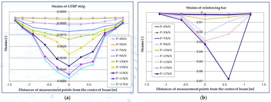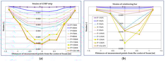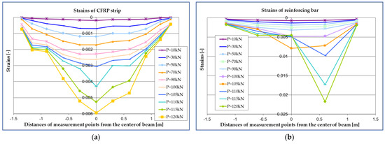 Additionally, the analysis covered the development of deformation of the CFRP strip and the reinforcing bar along the length of the beams for different load levels. Particular attention was paid to the mutual relations between the strip and bar strains in the same cross-sections of beams in the states preceding their failure. This was carried out for establishing the immediate cause of the initiation of failure. The layout of measurement points for recording longitudinal strains along the beams on the strip and on the middle reinforcing bar is shown in Figure 9.