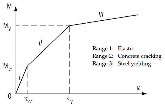 Idealization of M–κ relationship for reinforced concrete element according to [38].
