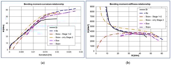 Figure 13 presents the curvature and stiffness diagrams both depending on the bending moment for the tested beams. These plots show the curvature changes for the sections in the middle of the spans of these beams (Figure 13a). For these cross-sections, the stiffnesses were then calculated and shown in Figure 13b.