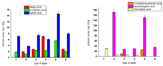 The total phenol content in the tested samples was found to be between 2662.4 mg/100 g and 267.7 mg/100 g (Table 5). Brown algae (E. crinita) had the highest values for antioxidant activity and polyphenolic content. With Chlorella spp., the values of the studied indicators were almost ten times lower. Despite their relatively high polyphenol content, U. intestinalis showed lower antioxidant activity compared to C. linum according to HORAC.