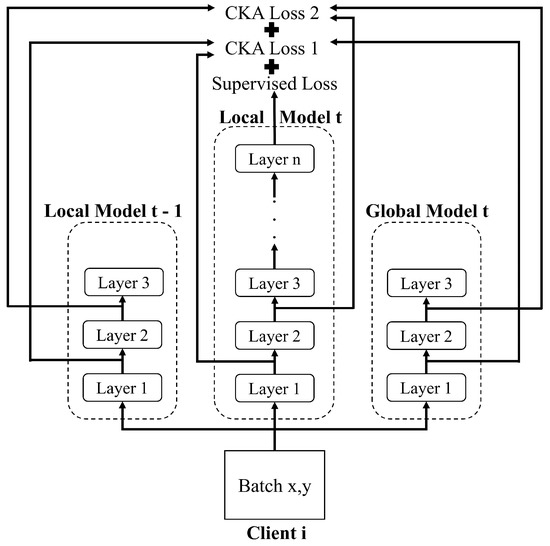 FedCKA adds a regularization term to the local training process of the default FedAvg algorithm, keeping the entire framework simple. Algorithm 1 and Figure 3 shows the FedCKA framework in algorithm and figure form, respectively. More formally, we add as a regularization term to the FedAvg training algorithm. The local loss function is as shown in Equation (1).