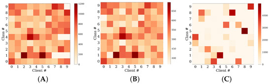 Distribution of the CIFAR-10 dataset across 10 clients according to the Dirichlet distribution. The x-axis shows the index of the client, and the y-axis shows the index of the class (label). (A–C) shows the data distribution of , , and , respectively. As parameter approaches 0, the heterogeneity of class distribution increases.