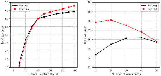 We also explore the effects of the number of local epochs on overall performance. We find that the performance of both FedAvg and FedCKA increases slightly when the number of local epochs increased. However, when further increasing the number of local epochs, we find that accuracy decreases, suggesting overfitting. The small increase in performance does not warrant additional local epochs. Clients are limited in their computational budget. Thus, computation cannot be used sparingly.