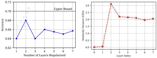 Accuracy with respect to the number of layers regularized and variance in similarity measures between clients on CIFAR-10 and .