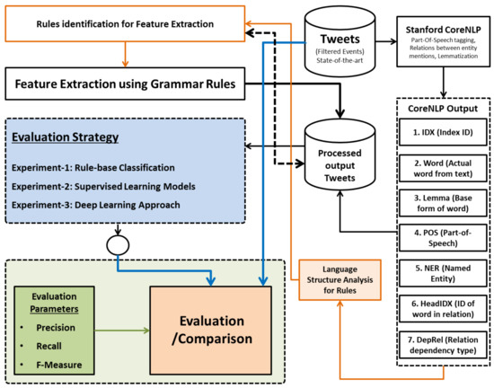 First, we processed each tweet through a pre-processing module to remove any noise. Afterwards, the noise-free tweets were tokenized and annotated using the part-of-speech (POS) tagger. The selected tagger can also perform the lemmatization, NER, and entity-relationship functions. We used the CoreNLP tools that label every tweet word to the corresponding part-of-speech (POS) tag and also recognize the relationship among the words within the sentence. The output was then critically analyzed to identify the grammar rules for all features shown in Table 1.