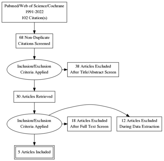 Our initial search yielded 102 studies. The initial screening steps (duplicates, language) excluded 34 studies. Abstract screening was thus conducted on 68 studies, of which 30 were retrieved for full-text evaluation, and 18 studies were excluded (not screening adults, not comparing mTBI adult patients and healthy controls, not providing information on the demographic description of the population samples). During the data extraction process, 12 studies were excluded (not reporting in the Montreal Neurological Institute (MNI) or Talairach space or not providing detailed coordinates for volumetric changes). Thus, the present voxel-wise meta-analysis was finally conducted on five relevant studies [22,23,24,25,26].