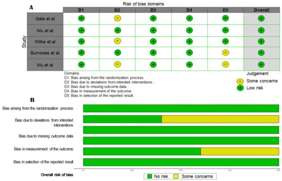 (A) Risk of bias assessment for individual studies (refs. [22,23,24,25,26]) included in the meta-analysis and (B) summary of the risk of bias of the selected studies.