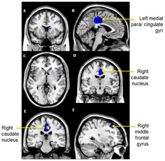 Our analysis showed increased GM volume in the left median cingulate/paracingulate gyri (Brodmann field 23, MNI: −2, −32,36, SDM-Z 1.909, p < 0.0001, voxels: 1259), the right middle frontal gyrus (Brodmann field 9, MNI: 28, 30, 42, SDM-Z 1.895, p < 0.0001, voxels: 282), and the right caudate nucleus (MNI: 8, 6, 4, SDM-Z 1.869, p < 0.0001, voxels: 206) (Figure 3A–F).