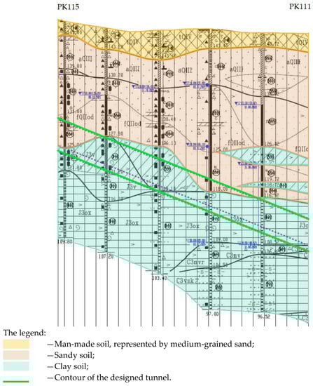 The investigated section of the tunnel’s longitudinal profile (Figure 1) was composed of sandy soils from the crown to the ground surface. However, the machine cutter contained predominantly clay soils. The distance from the tunnel top to the daylight surface varied from 23 to 29 m.