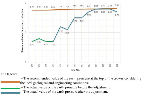 The determination of the technological parameter of the tunneling, the earth pressure, was calculated using the geological engineering benchmark data and design documents, according to the method presented in the Industry-wide Standard 2.27.19-2011 “Tunnel construction using tunnel boring machines and high-precision lining techniques”, issued by the National Association of Builders []. At the same time, as the TBM approached the monitoring object, large increments of deformations were recorded. It was decided to adjust the earth pressure considering the arching according to the Portodiakonov method [], which turned out to be higher. The calculated earth pressure according to the Portodiakonov method (red line) and the actual earth pressure (green and blue line) are shown in Figure 2. As shown further in the work, a gradual increase in the earth pressure enabled the stabilization of the supplementary building settlement.
