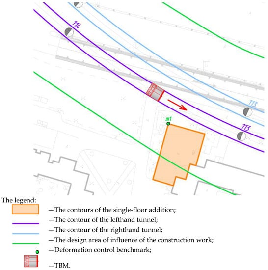 Fragment of the PK113-PK114 plan, including the building and the relative position of the designed tunnel.